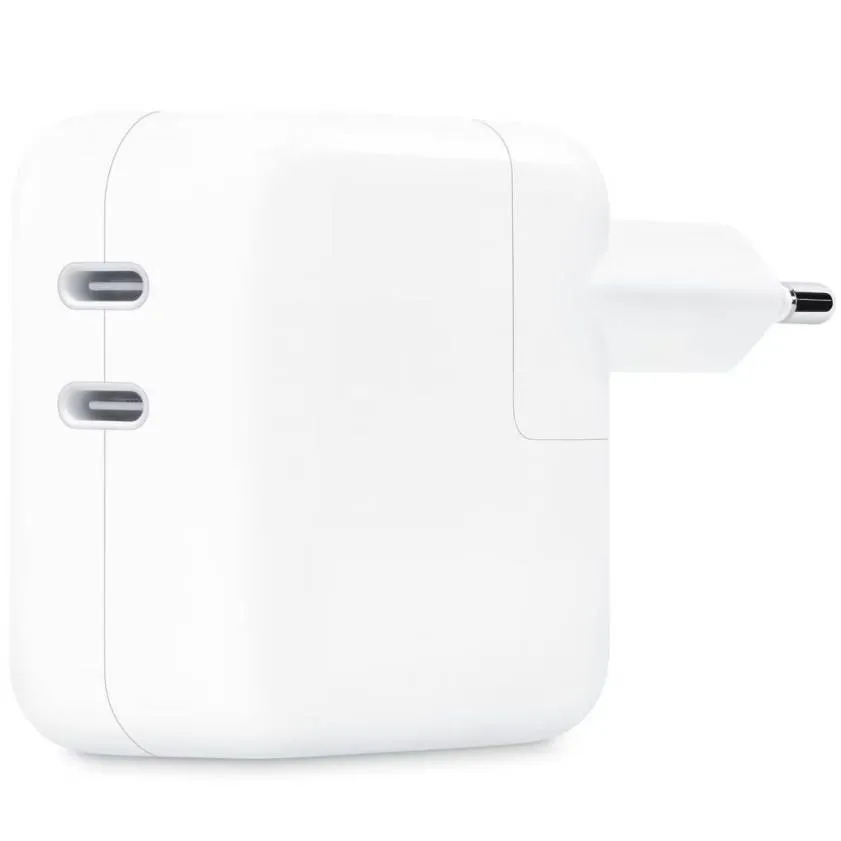 Оригинальный адаптер питания от Apple, позволяющий заряжать два устройства одновременно. Его мощность составляет 35 Ватт – достаточно даже для зарядки MacBook Air Retina, а каждый из портов USB-C поддерживает протокол Power Delivery. Как и многие другие сетевые ЗУ от Apple, аксессуар совместим с набором международных переходников (приобретается отдельно), а несмотря на высокую выходную мощность, сетевое ЗУ можно без опаски использовать даже для таких маломощных гаджетов как AirPods и Apple Watch, при наличии соответствующего кабеля с разъёмом Type-С.