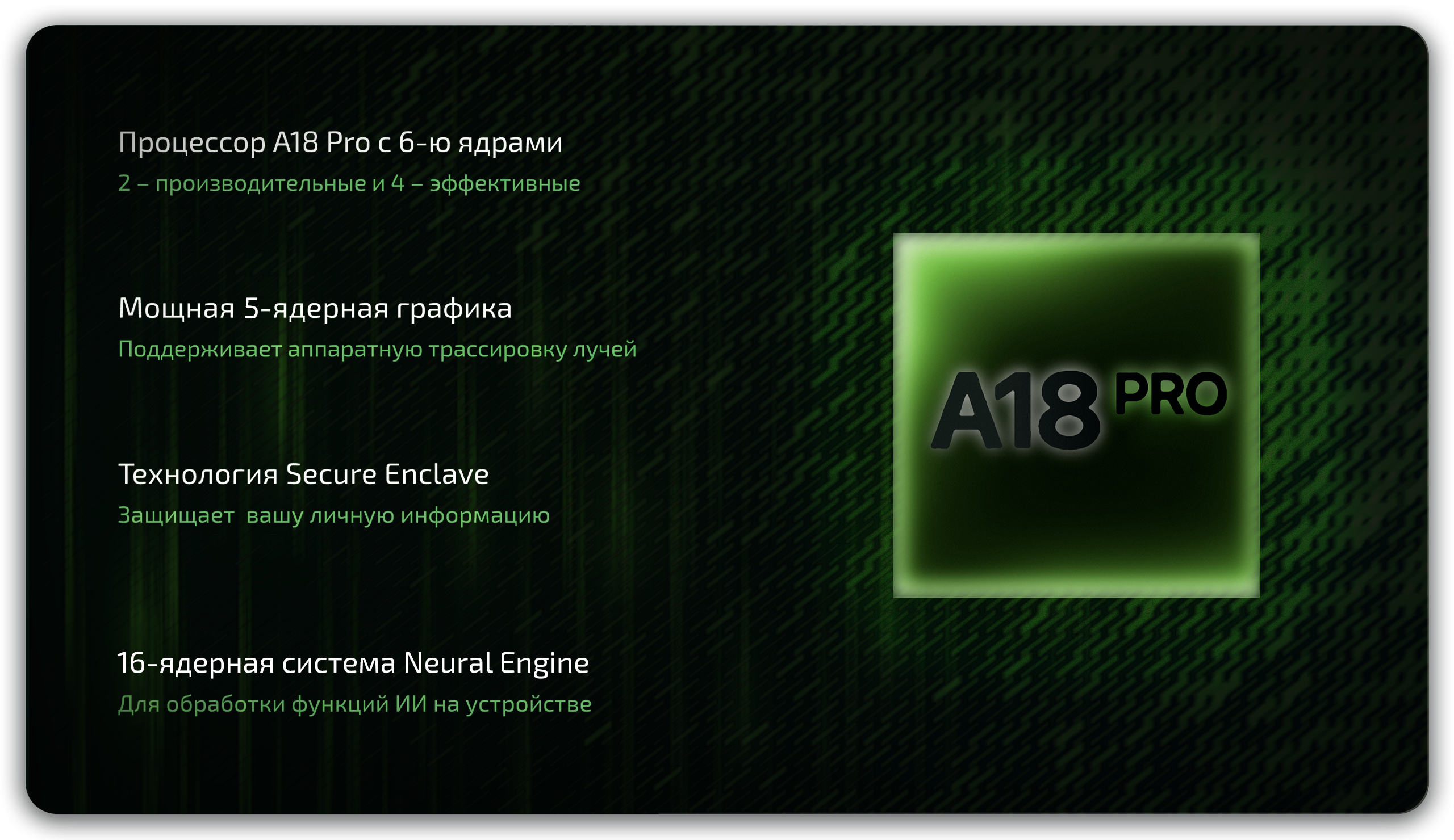 Кого-то может смутить, что в MacBook Neo используется процессор A18 Pro – от iPhone. Но только если не знать, что это за процессор. Во многих сценариях производительность этого чипа, сделанного по техпроцессу 3 нм, опережает Apple M1, который до сих пор актуален и отлично зарекомендовал себя в ноутбуках. В некоторых моментах A18 Pro даже лучше, например, по части графики: здесь даже есть аппаратное ускорение трассировки лучей. Присутствуют и медиа-ядра для ускорения кодирования и декодирования видео, так что несложный видеомонтаж ноутбуку тоже по плечу. Ну а в сочетании с быстрым SSD и ОЗУ (распаяны на плате), производительности MacBook Neo с лёгкостью хватит не только для повседневных задач, но и для учёбы (в том числе для изучения профессиональных приложений), и даже поиграть в игры из каталога подписки Apple Arcade можно с комфортом.