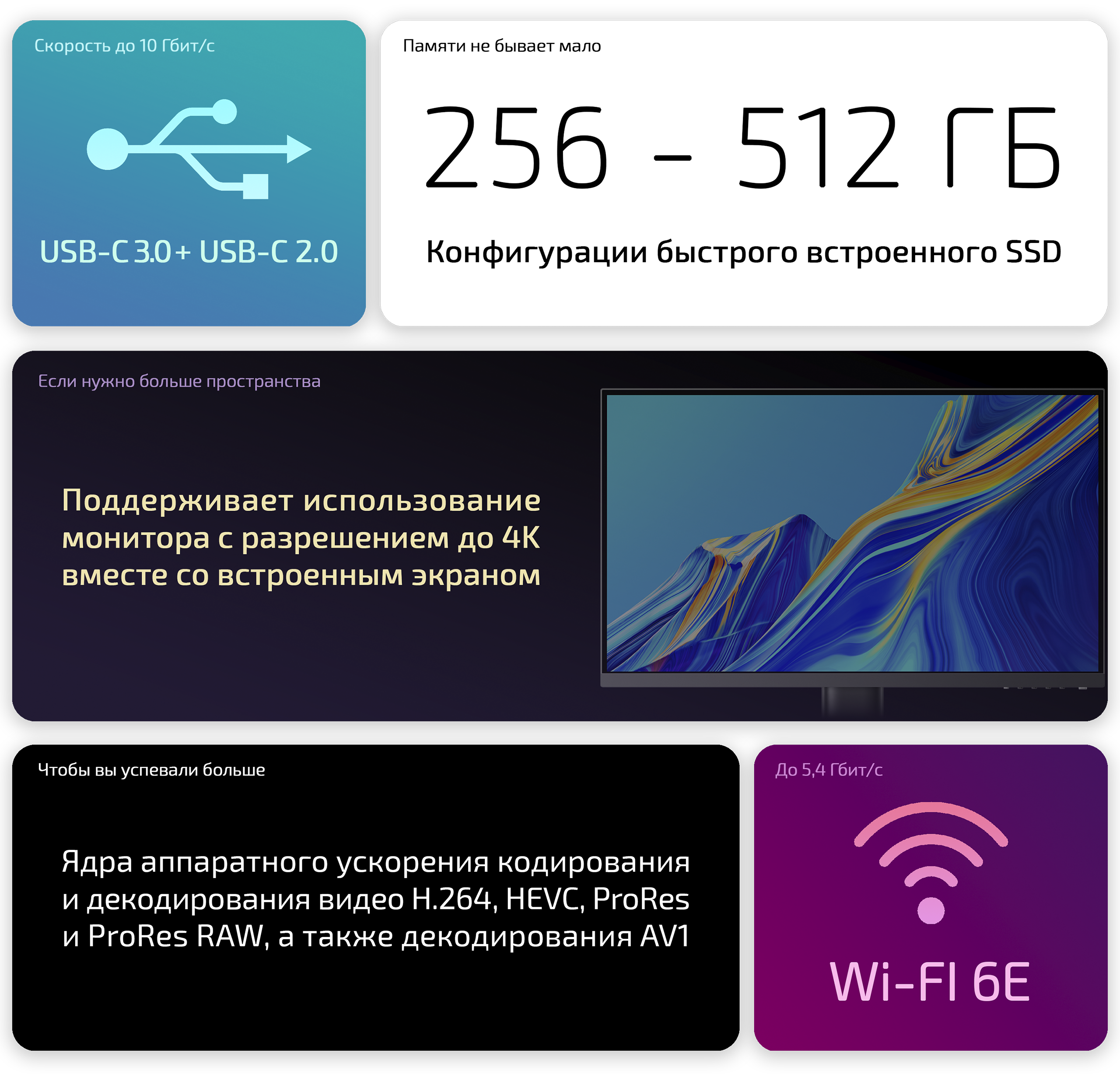 А что, если хочется собрать себе рабочий стол как в ASMR-видео? Купить механическую клавиатуру, подобрать большой 4K-монитор, добавить аксессуаров… Можно! И даже проводные наушники тоже есть куда подключить, причём без переходников. Ноутбук получил два USB-C, один из которых поддерживает скорость передачи данных до 10 Гбит/с и может использоваться для подключения мониторов (до 4K с частотой 60 Гц) и быстрых накопителей. Второй порт ограничен скоростью USB 2.0, но для мышек и флешек с документами вполне подойдёт, причём оба можно использовать для зарядки, поэтому быстрый порт можно не занимать адаптером.